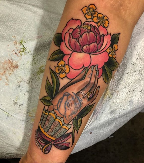 Neo trad tattooed hand and flower tattoo by @ebony_mellowship