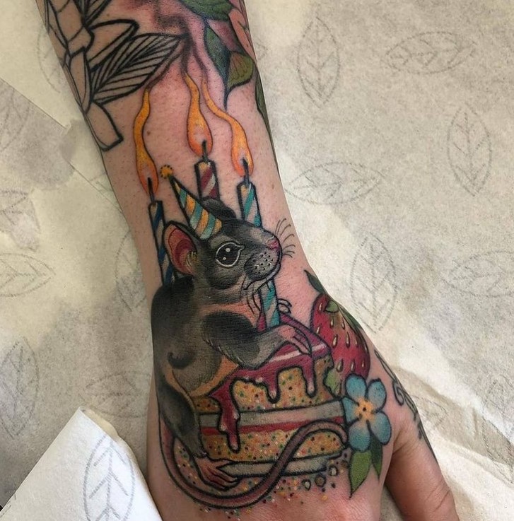 Neo trad birthday mouse enjoying some cake. Hand tattoo by @ebony_mellowship