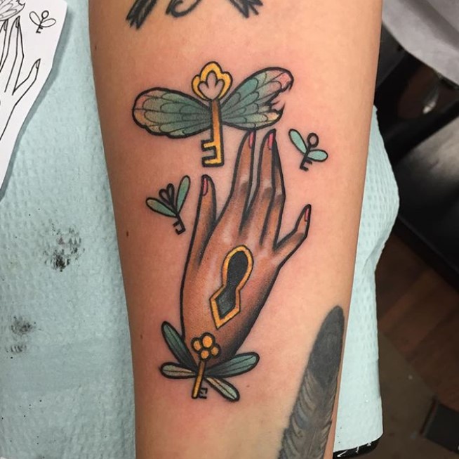 Neo trad Flying Key (Harry Potter) themed hand tattoo by @ebony_mellowship