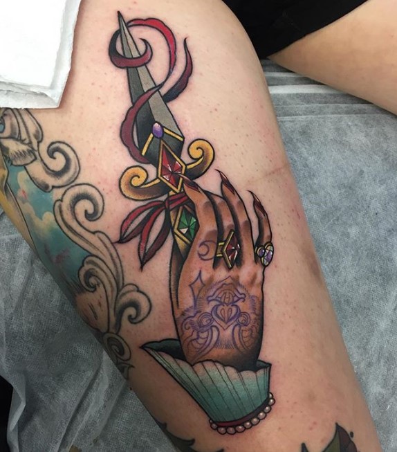 Neo trad hand and dagger tattoo by @ebony_mellowship