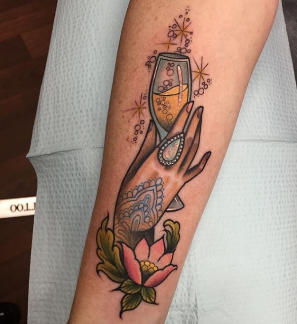 Neo trad hand and glass of champagne tattoo by @ebony_mellowship