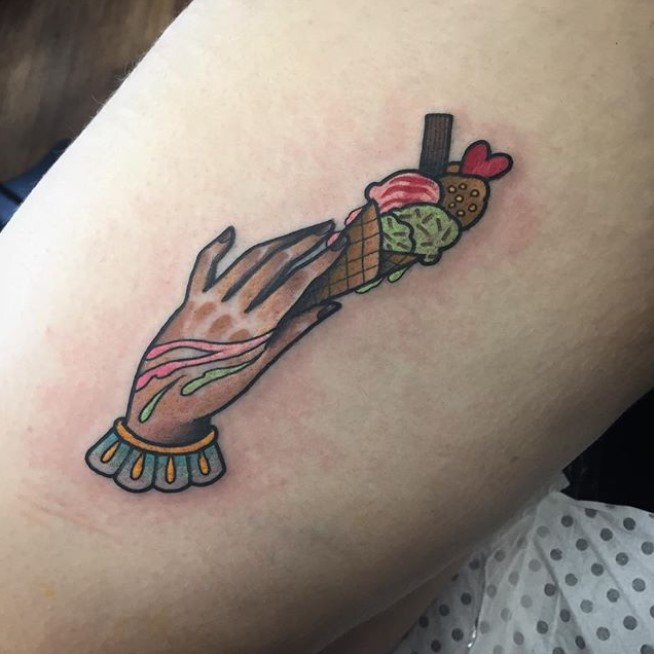 Neo trad hand and ice cream cone tattoo by @ebony_mellowship