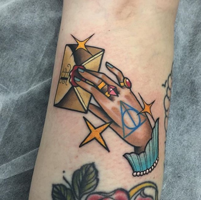 Neo trad hand holding a Hogwart’s acceptance letter tattoo by @ebony_mellowship
