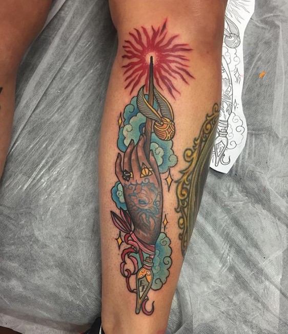 Neo trad Gryffindor themed hand and wand tattoo by @ebony_mellowship