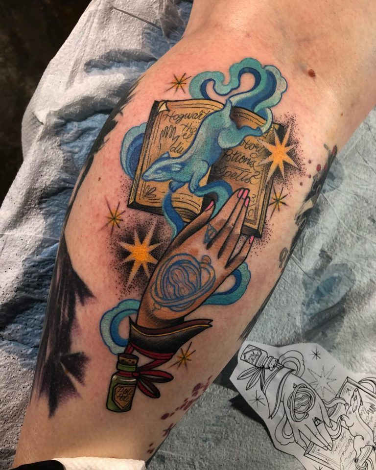 Neo trad Hermione inspired hand tattoo, book and Hufflepuff patronus tattoo by @ebony_mellowship