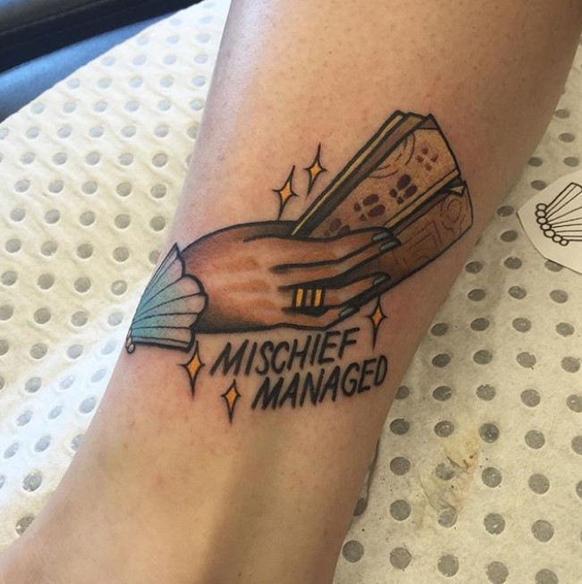 Neo trad Marauder’s Map (Harry Potter) and hand tattoo by @ebony_mellowship