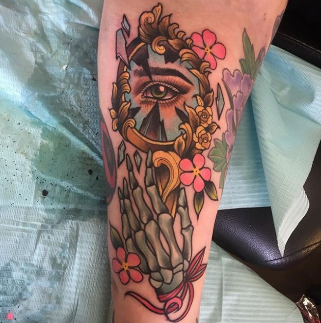 Neo trad skeleton hand and broken mirror tattoo by @ebony_mellowship