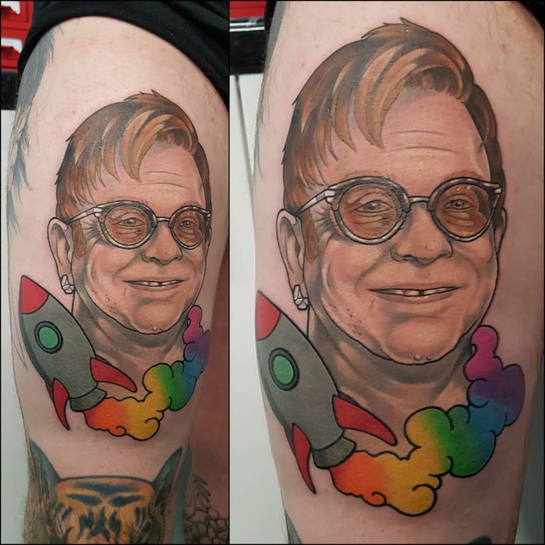 The legendary singer, Elton John is currently on a 300 date farewell tour which is due to end next month in Stockholm, Sweden. In celebration of almost 55 years since the release of his debut album, I’ve gone looking for the best Elton John themed tattoos. This was actually a far more difficult task than I had anticipated. For a man with such a decorated career and over 300 million records sold, it is weird how few people have decorated their own bodies with a portrait of the man himself, compared to other far less successful musicians.