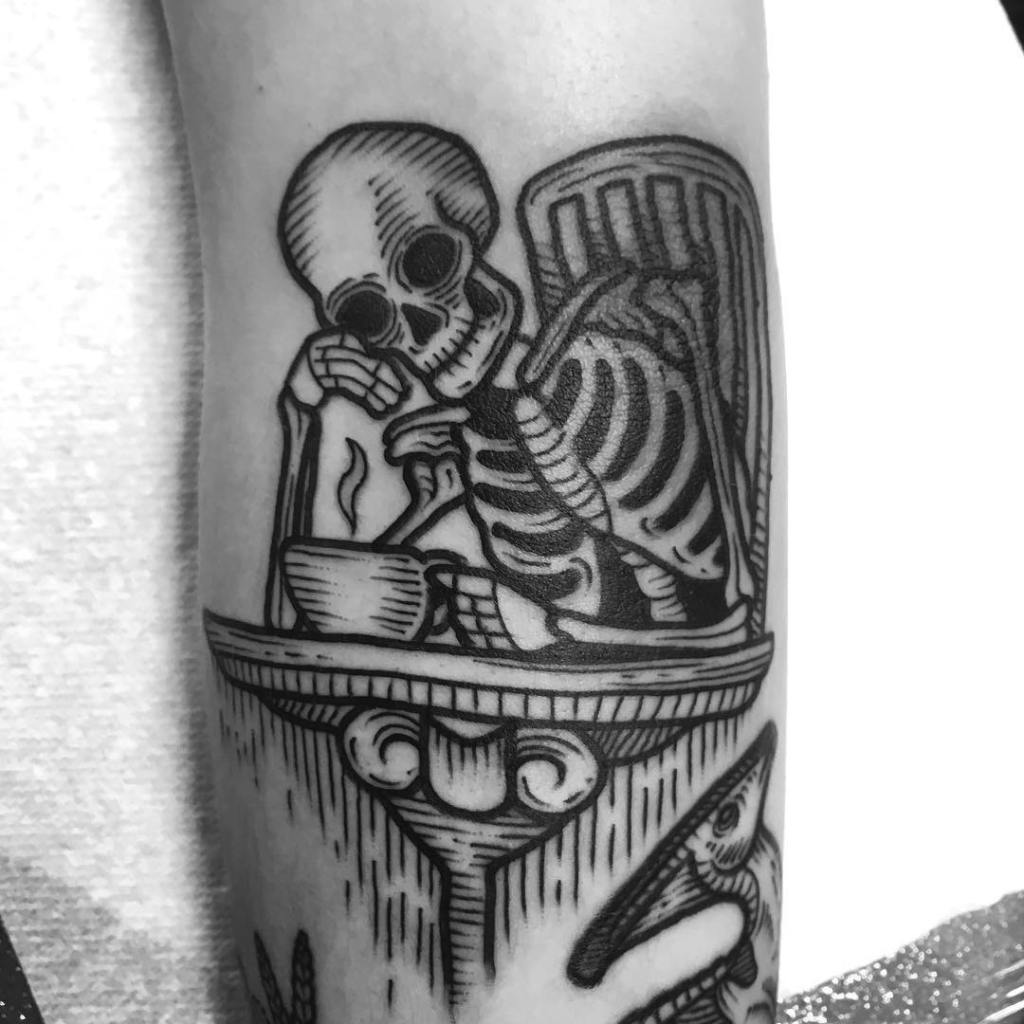 Blackwork skeleton and coffee tattoo by @trash_haus