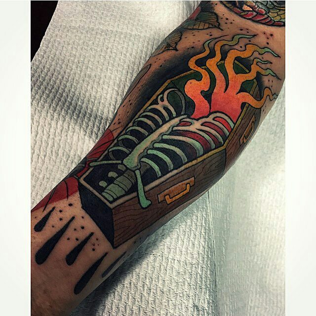 Coffin and flaming skeleton tattoo by @alex_sances_one