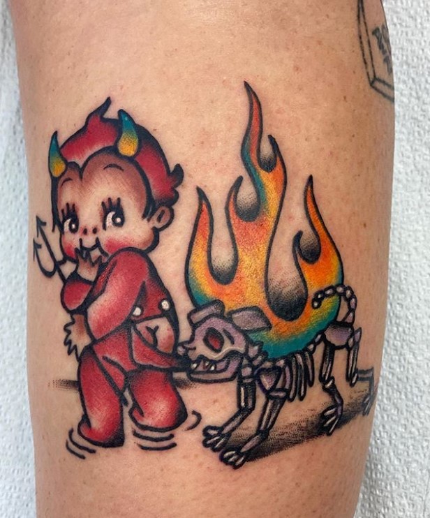 Devil kewpie and skeleton dog tattoo by @jenn_matthews
