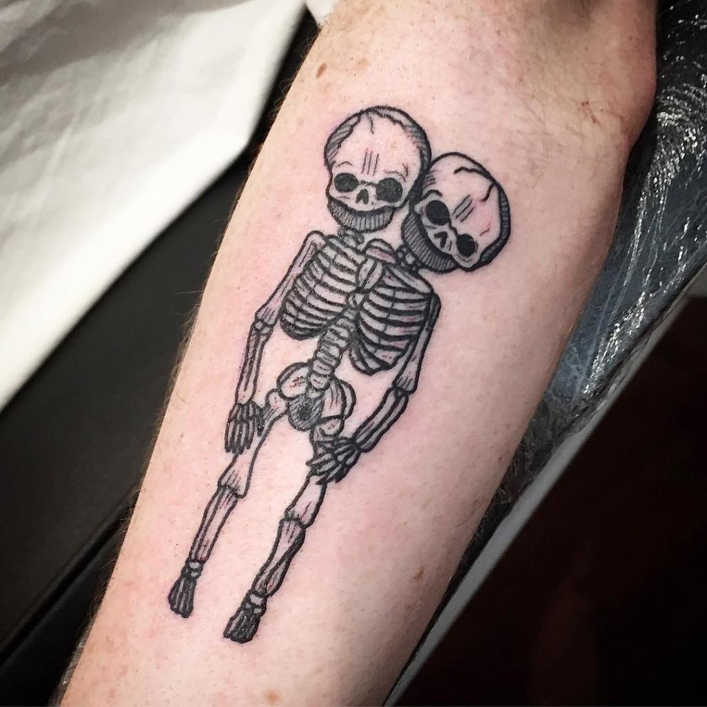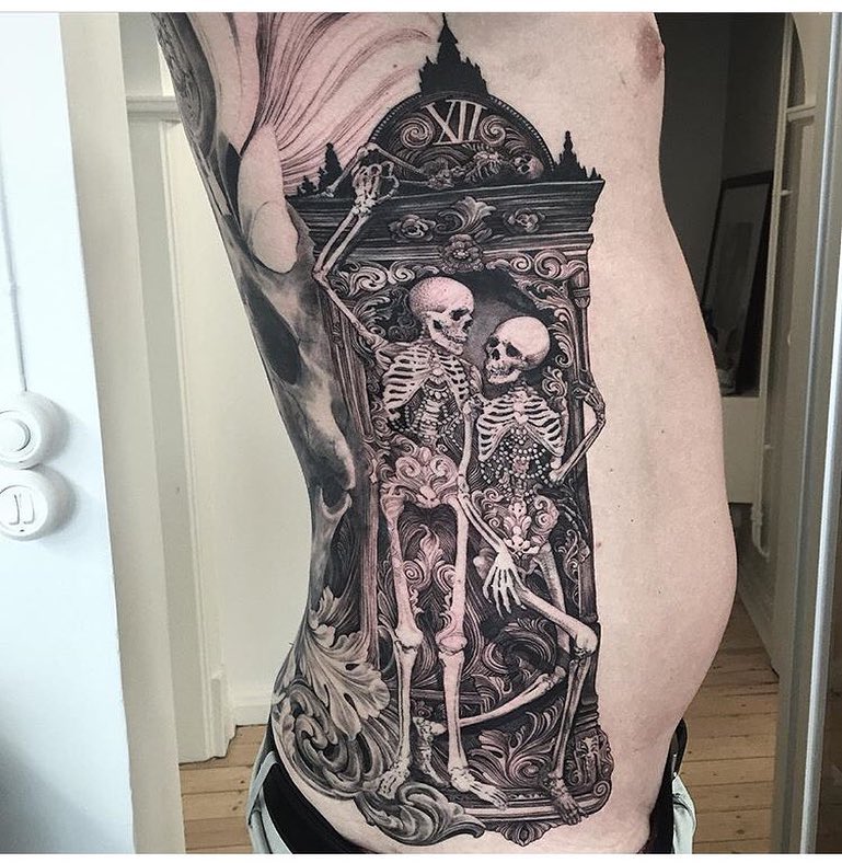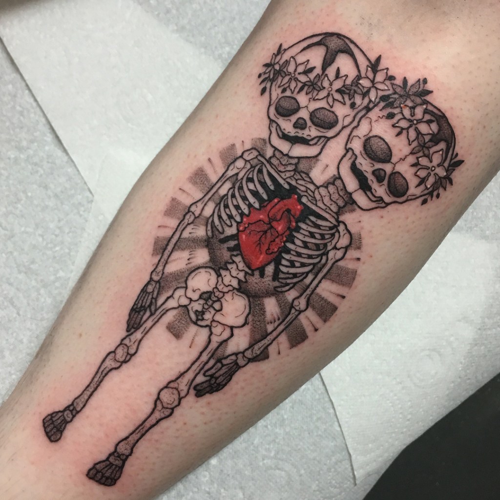 Decorative black and grey skeleton couple tattoo by @ellenwestholm