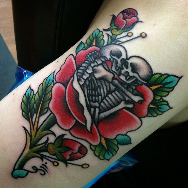 Traditional style kissing skeletons and rose tattoo by @amandaslatertattoo