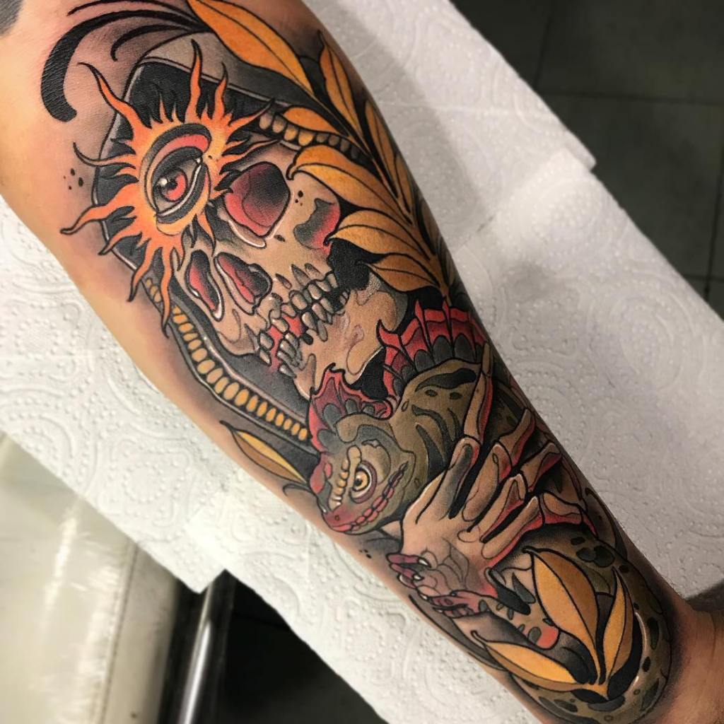 Neo trad skeleton and reptile tattoo by @fedealmanzor