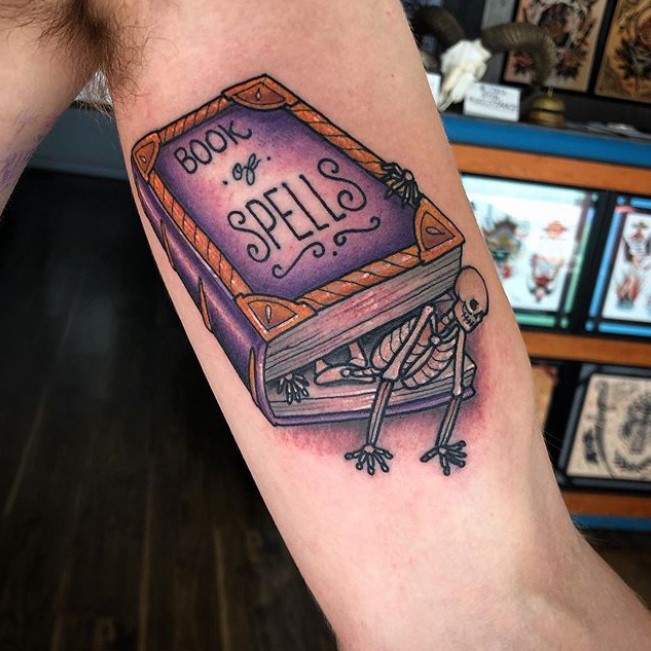 Neo trad spellbook and skeleton tattoo by @sadee_glover