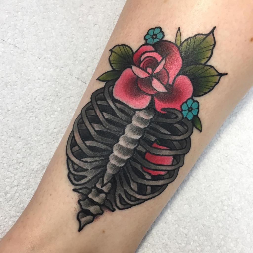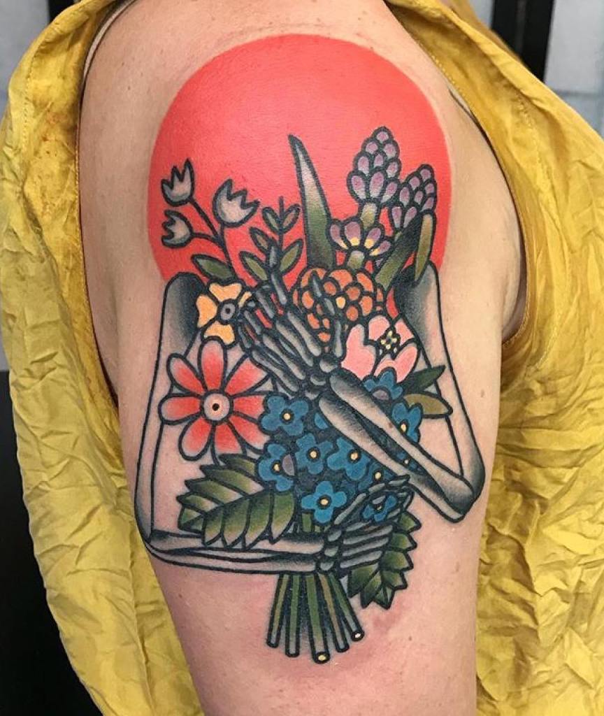 Traditional style skeleton holding flowers tattoo by @juliacampione