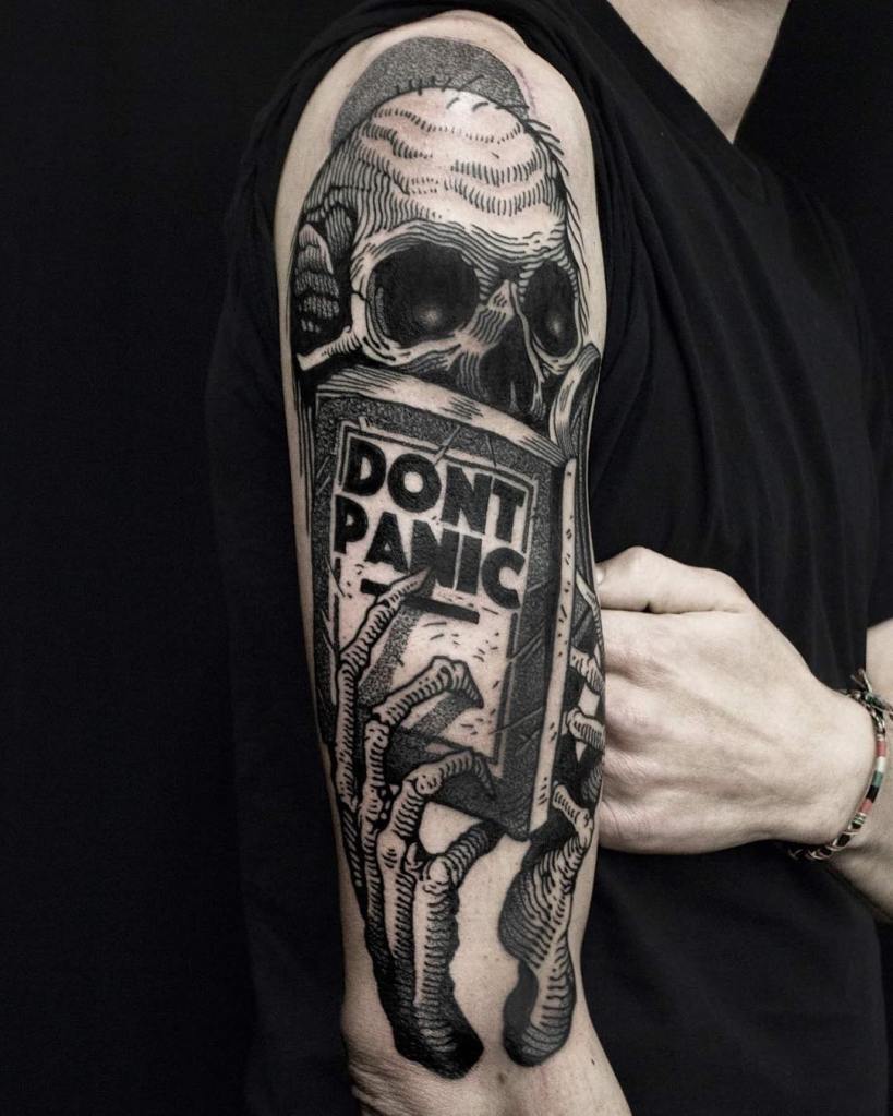 Don’t Panic. Blackwork skeleton and book tattoo by @mishlatattooillustration