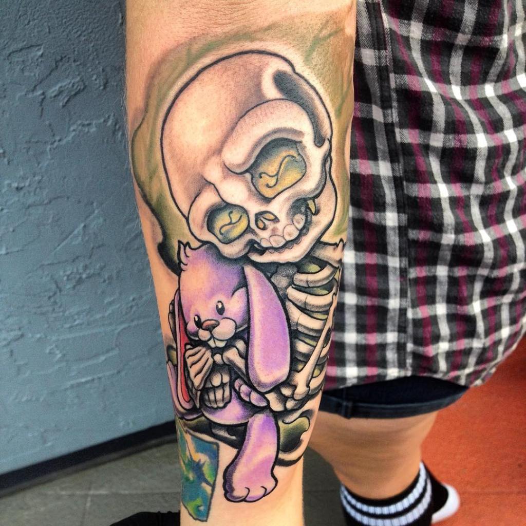 New school skeleton and plush rabbit tattoo by @tat2marks