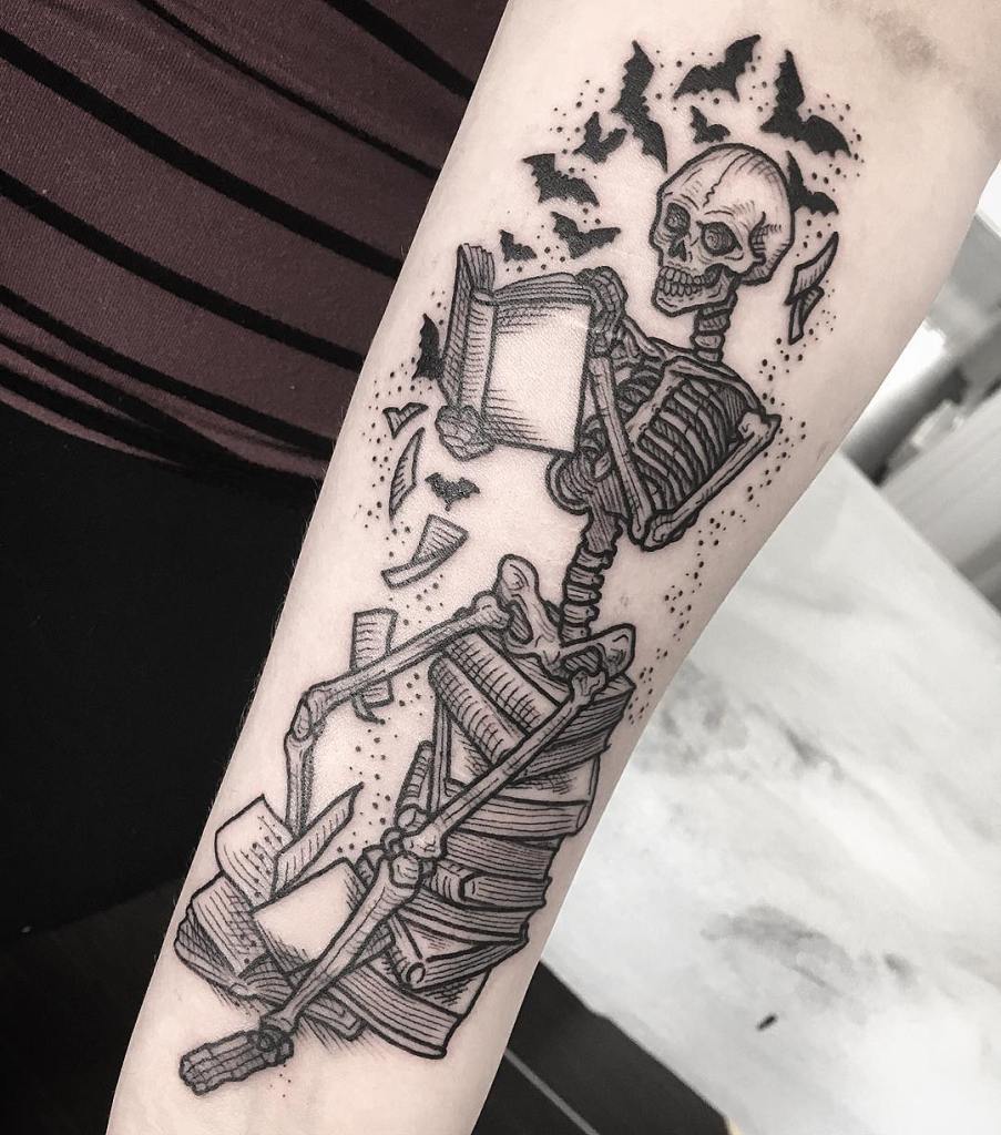 Blackwork skeleton, book and bats tattoo by @sherlybird