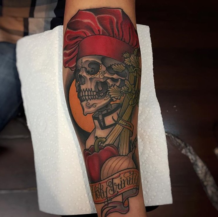 Skeleton chef, capsicum, celery and onion tattoo by @abel_rdt