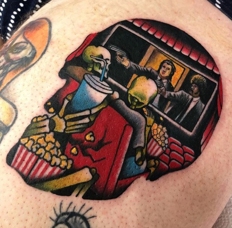 Skeletons at the cinema watching Pulp Fiction double exposure skull tattoo by @samkanetattoo