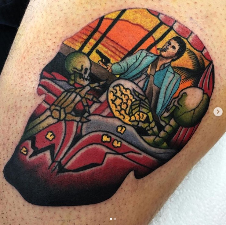 Skeletons watching Scarface double exposure skull tattoo by @samkanetattoo