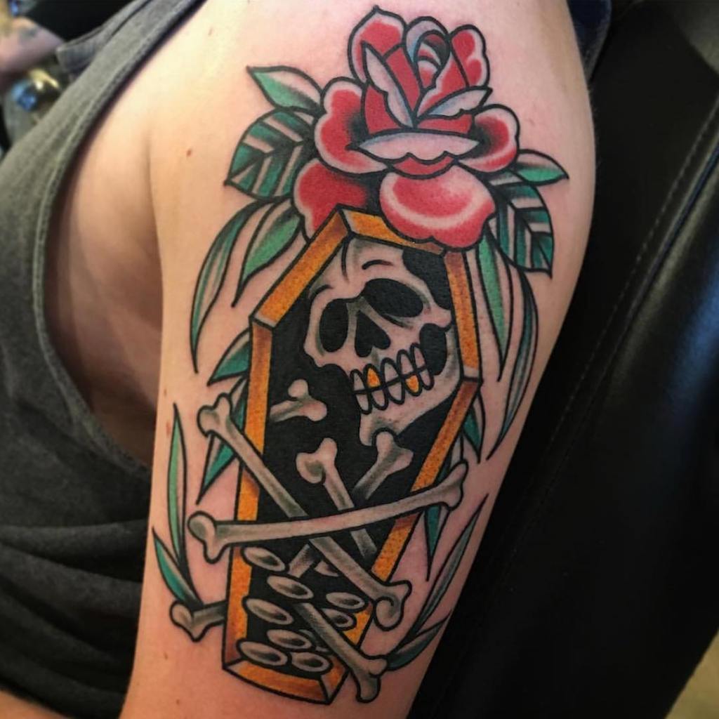 I’ll see you on the other side. Skeleton, coffin and rose tattoo by @abel_av