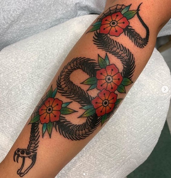 Traditional snake skeleton tattoo by @fakelegfoxtattoo