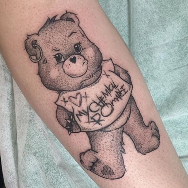Blackwork My Chemical Romance themed Care Bear tattoo by @sammy.tattoo