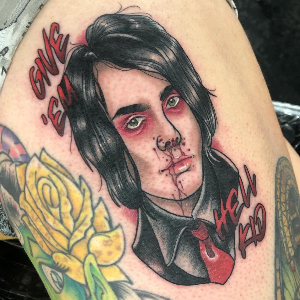 Traditional style Gerard Way tattoo by @curlsjrtattoos