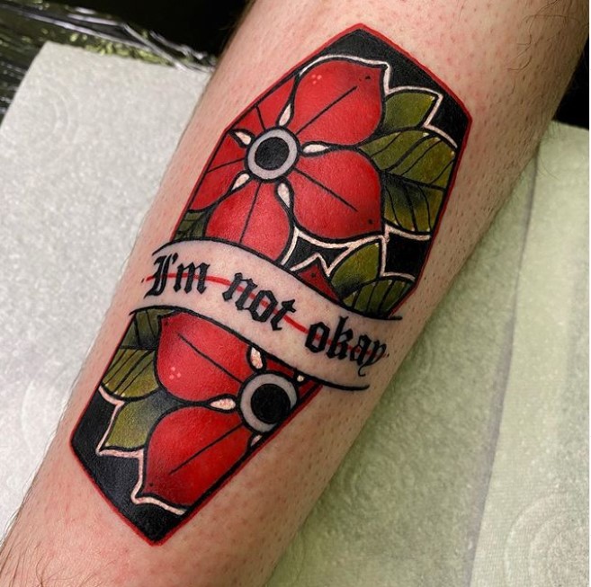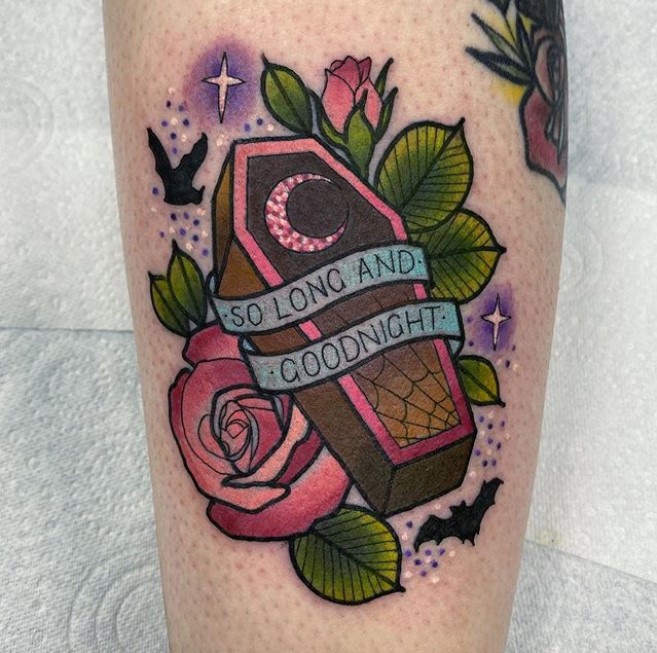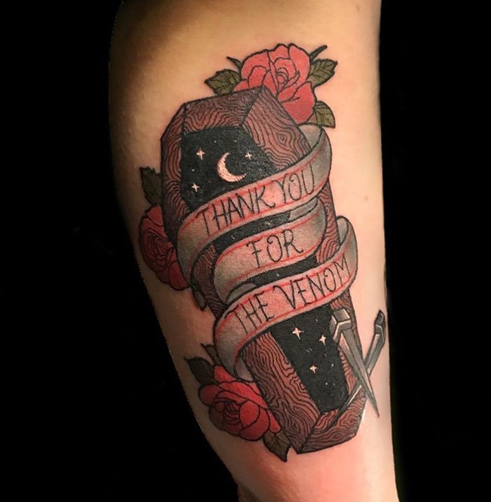 Neo trad My Chemical Romance themed coffin tattoo by @ashleyluka