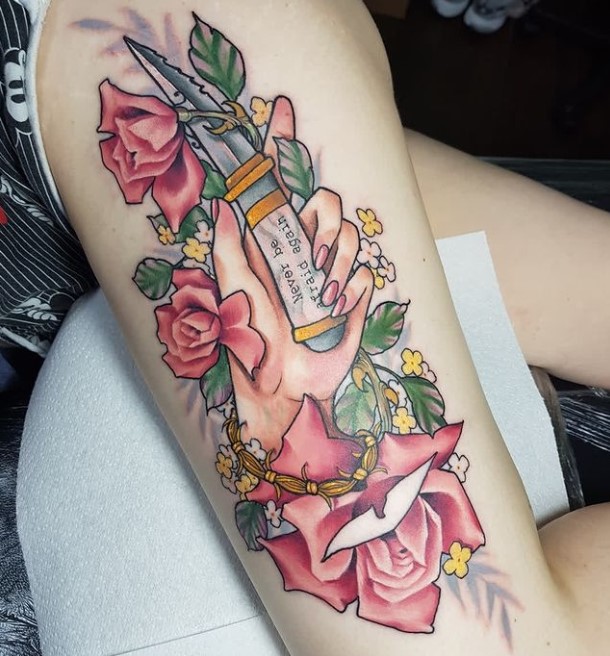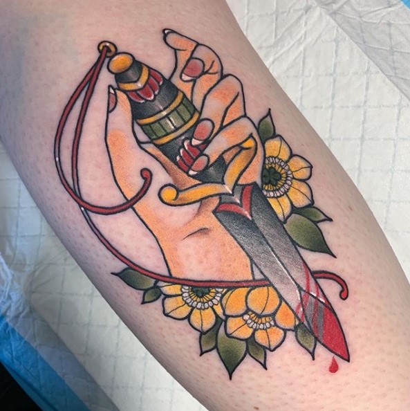 My Chemical Romance themed hand and dagger tattoo by @amandabrookstattoo