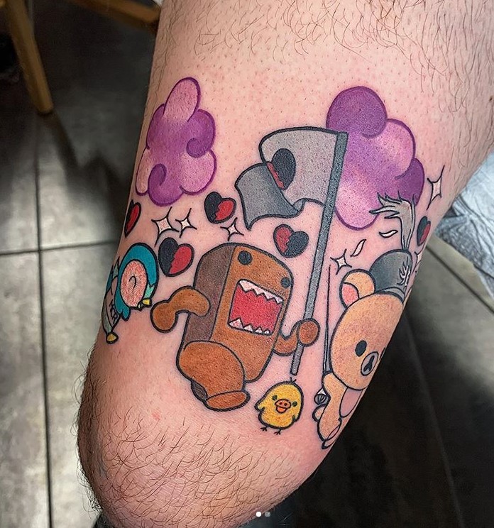 Pokémon, Rilakkuma, and Domo x My Chemical Romance tattoo by @honeyxdriptattoo