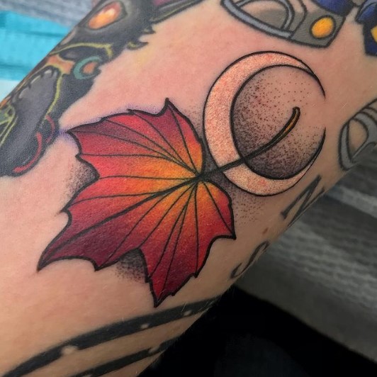 Autumn leaf and crescent moon tattoo by @charlotte.e.tattoos