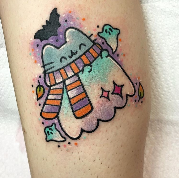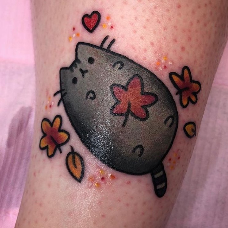 Pusheen and autumn leaves tattoo by @littlerachtattoo