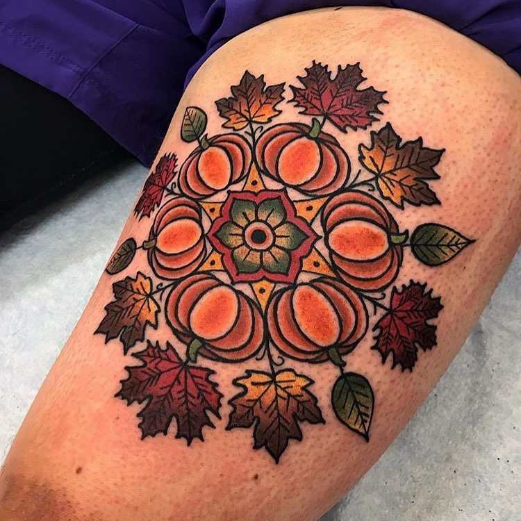 Traditional style autumnal mandala tattoo by @shannontattooer