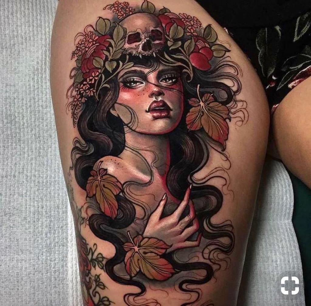 Illustrative autumnal woman tattoo by @hannahflowers_tattoos