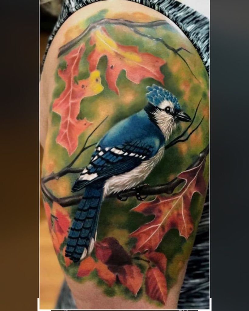Colour realism autumn leaves and blue jay tattoo by @jeff_parkway