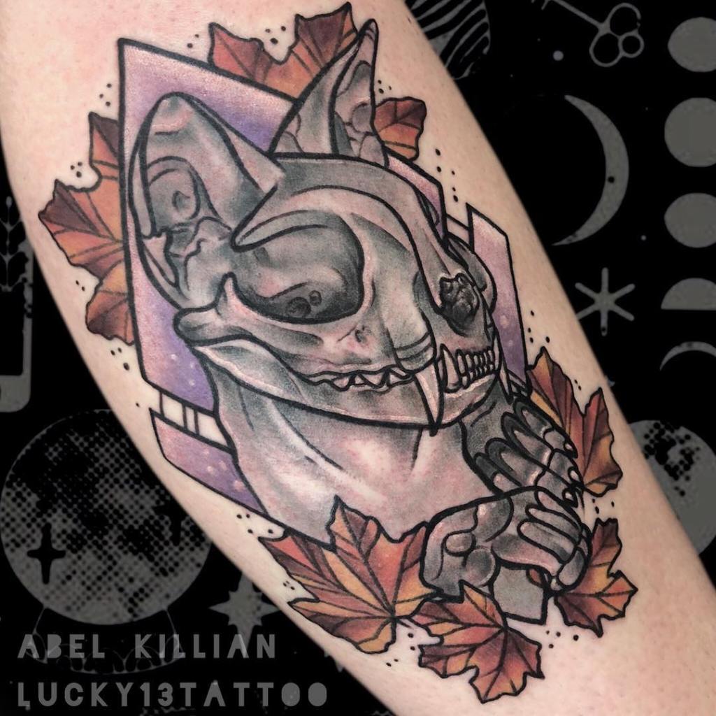 Cat skeleton and autumn leaves tattoo by @tattooabel