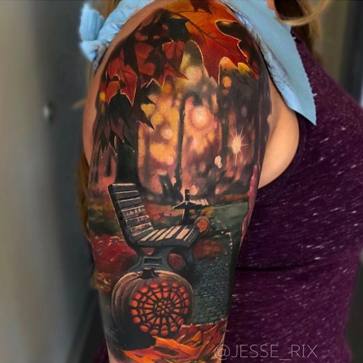Colour realism autumn themed half sleeve tattoo by @jesse_rix