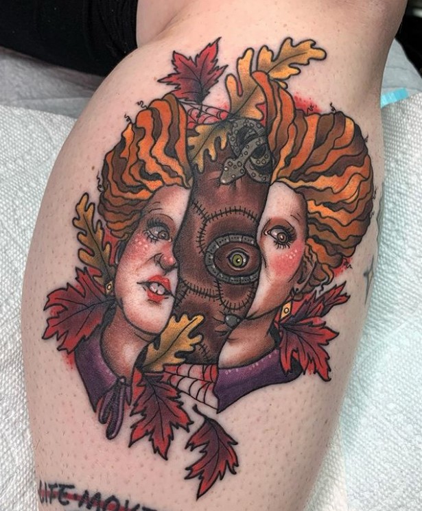 Fall themed Winifred Sanderson face split tattoo by @ismonkah