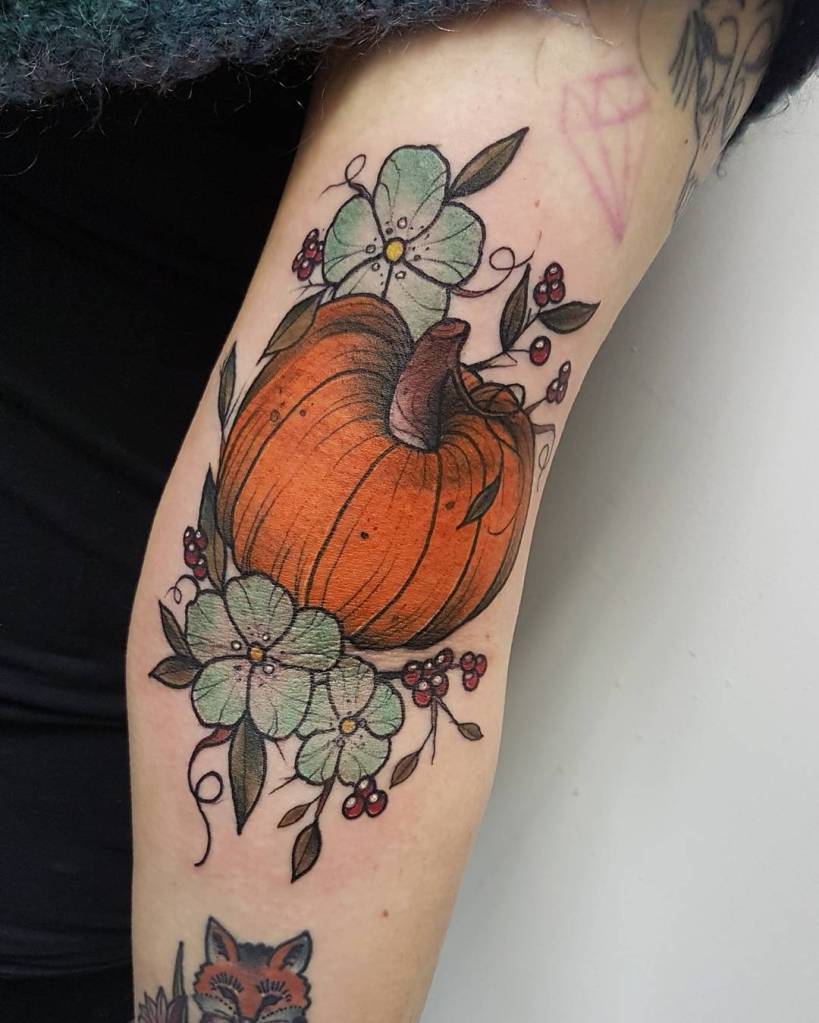 Neo trad floral pumpkin tattoo by @livmorgantattoo