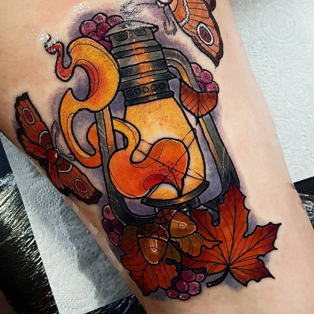 Neo trad lantern and autumn leaves tattoo by @hanahelizabethtattoo
