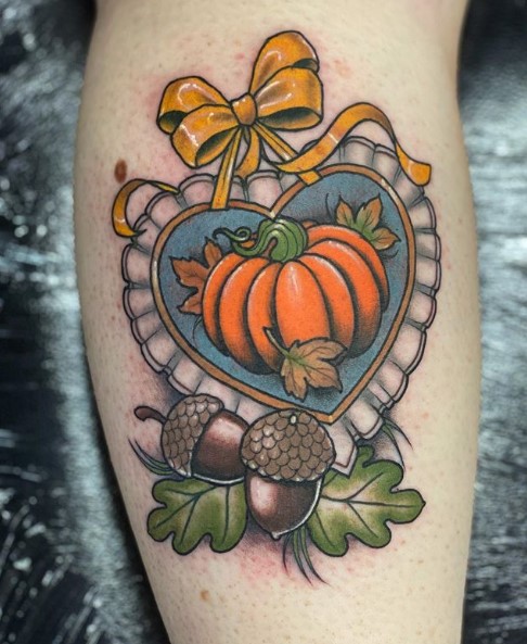 Neo trad Autumn themed love heart tattoo by @sadee_glover