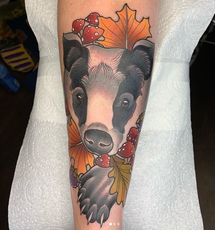 Neo trad autumnal badger tattoo by @alexrowntreetattoo