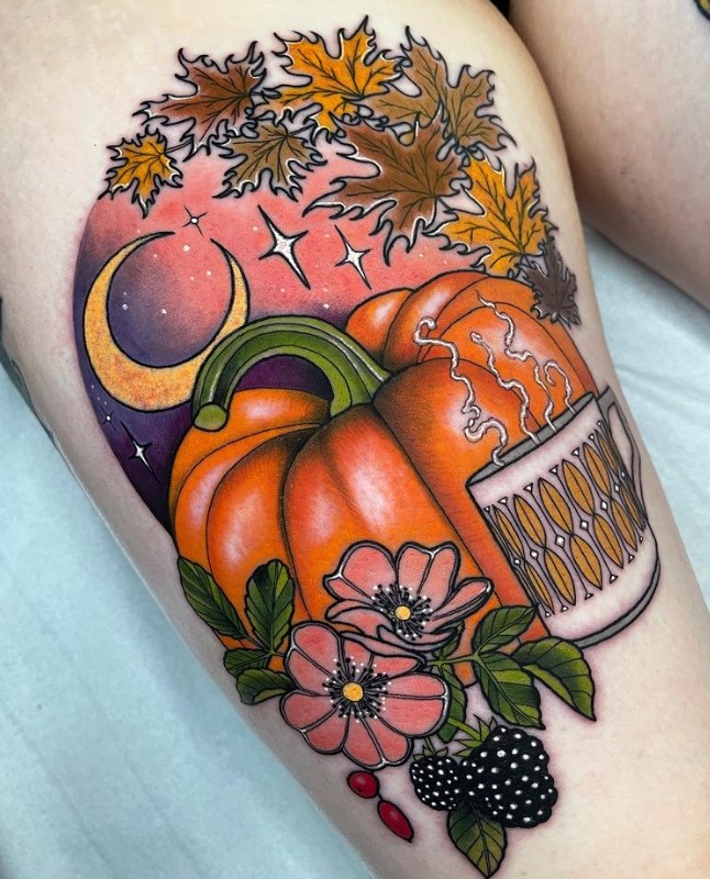 Neo trad Autumnal leaves and Pumpkin Juice tattoo by @codydresser