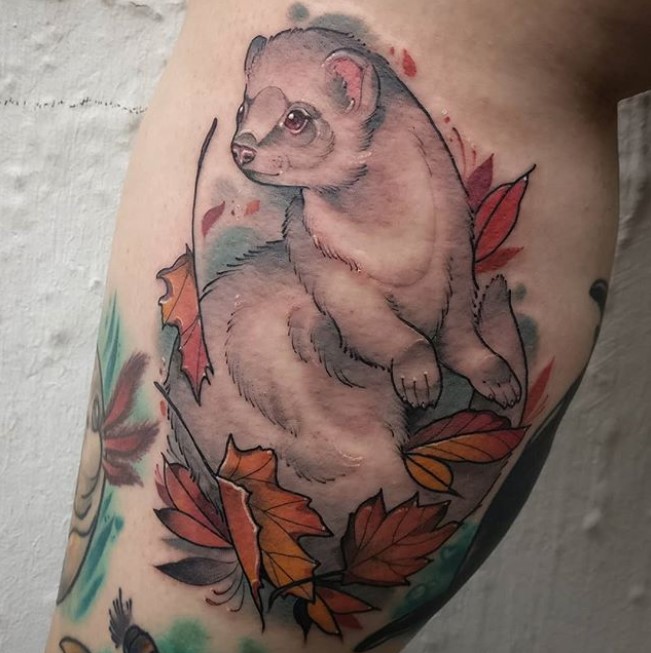 Neo trad ferret and fall leaves tattoo by @kijatattooartist