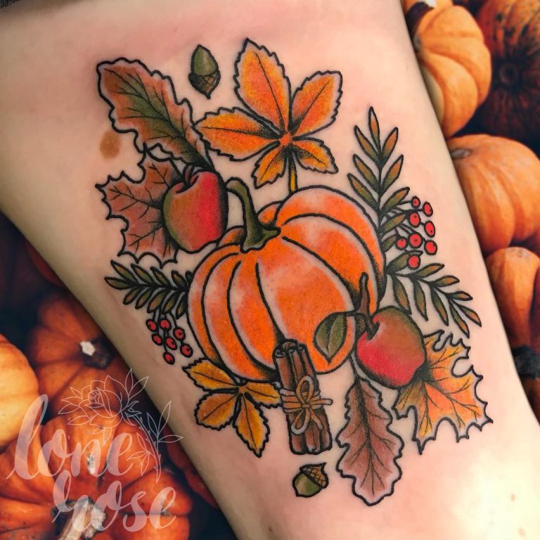 Traditional style pumpkin, apple, cinnamon stick and fall leaves tattoo by @lonerosetattoo