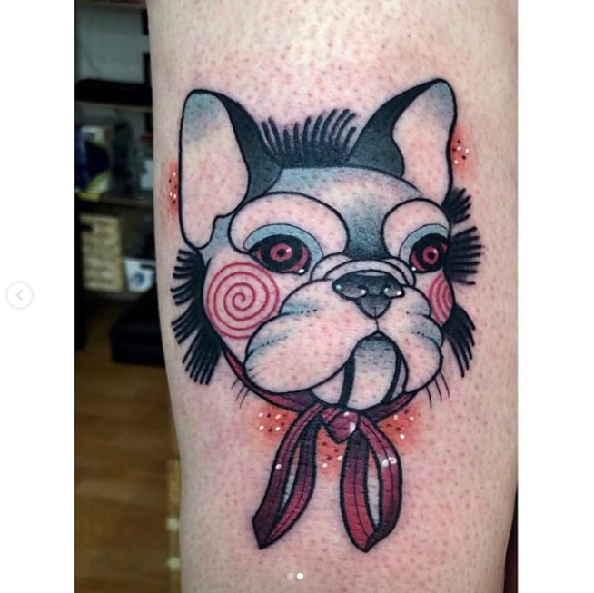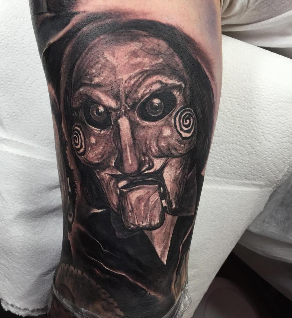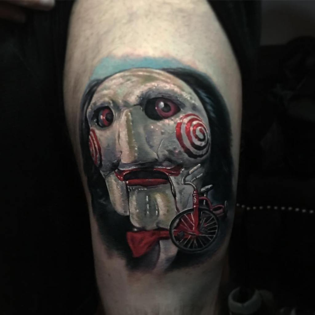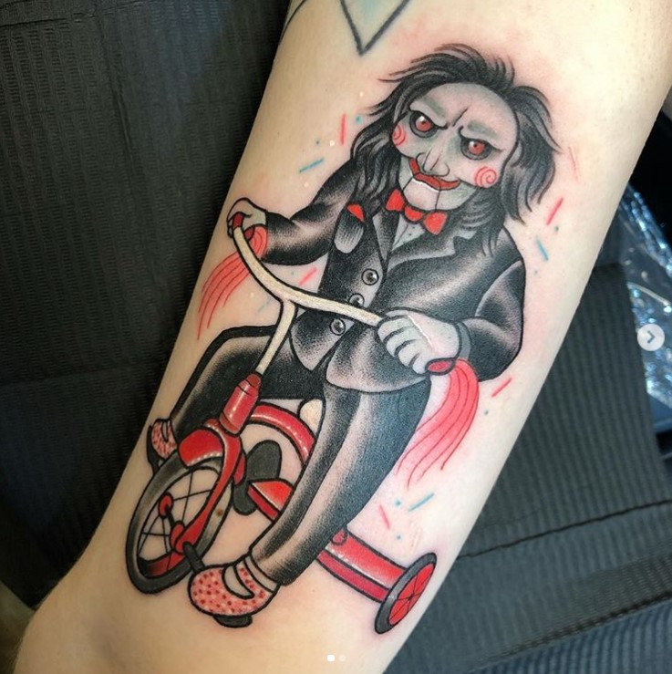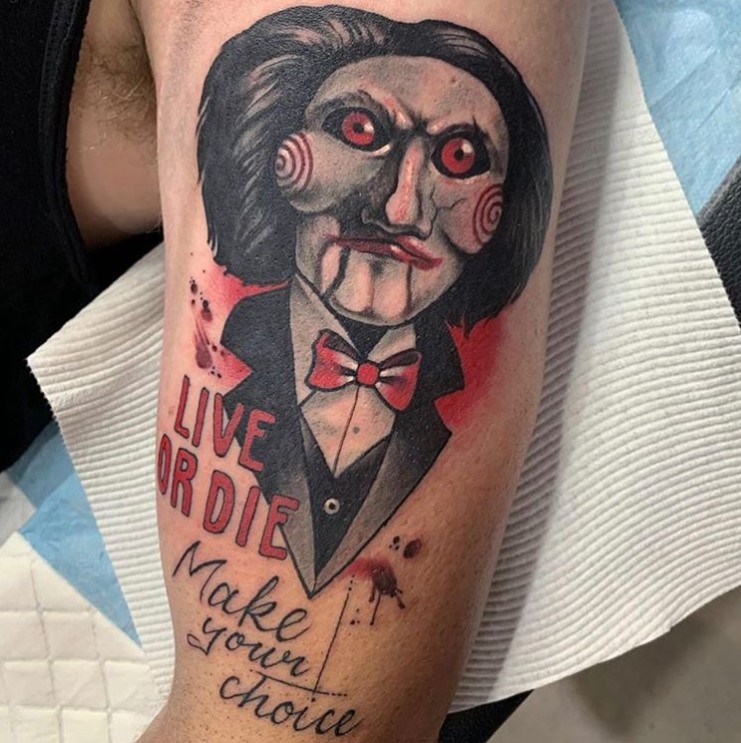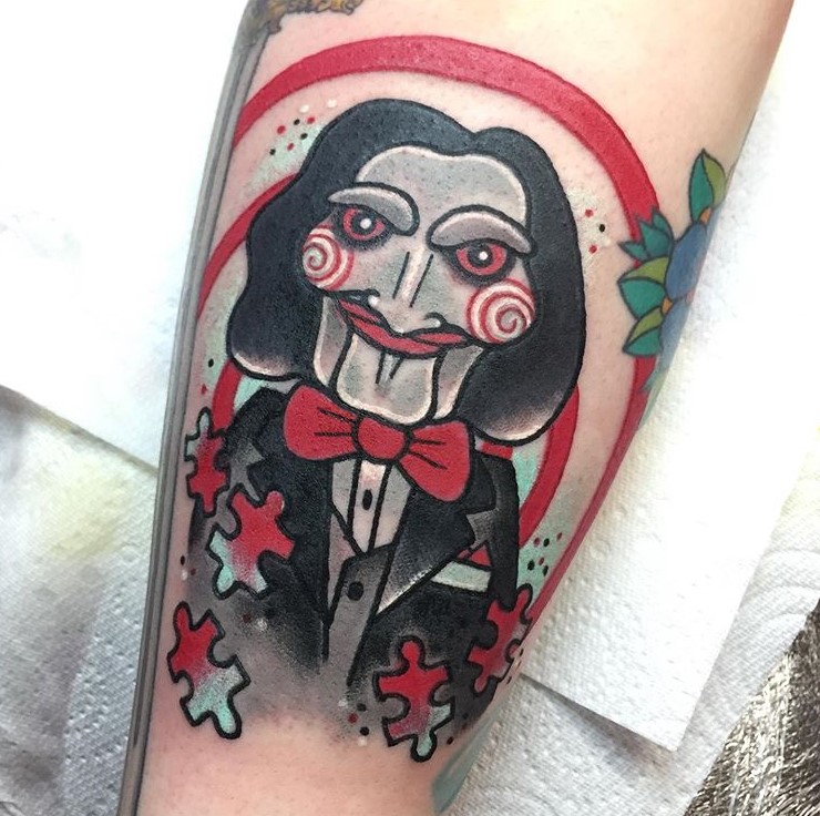 Outside of the horror genre, Billy the Puppet has made more than a couple of appearances in popular culture, from wrestling, to TV’s The Office, and several animated series including The Simpsons, The Cleveland Show, and The Fairly OddParents, so it’s the perfect opportunity to ask your chosen tattoo artist for some sort of a mashup tattoo.