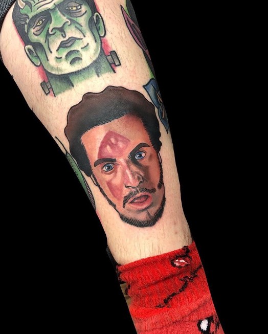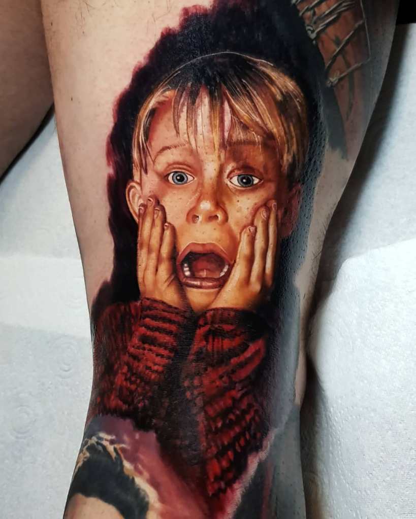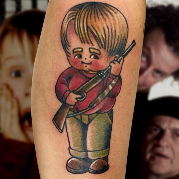 A Home Alone tattoo doesn’t automatically have to be a portrait of Kevin [Macaulay Culkin] or anything too obvious. Re-watch the films and pay close attention to every detail and see what catches your eye or sparks your creativity. It could be a visual element accompanied by a quote or even a quote from the film within the film. Choose something to represent a favourite character, a booby trap, or one scene of the film that you always look forward to most.